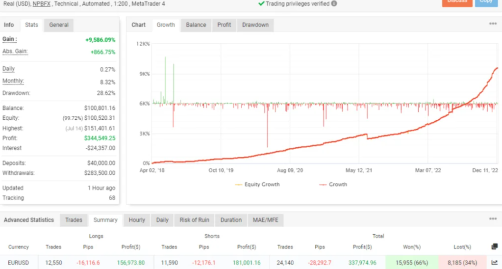 This Forex EA employs a combination of Martingale and other trading strategies, offering a high ROI (Return on Investment). However, due to the nature of this approach, there’s almost a 100% risk of account depletion if you do not maintain a sufficient deposit. The monthly profit depends on the chosen lot size and risk settings.